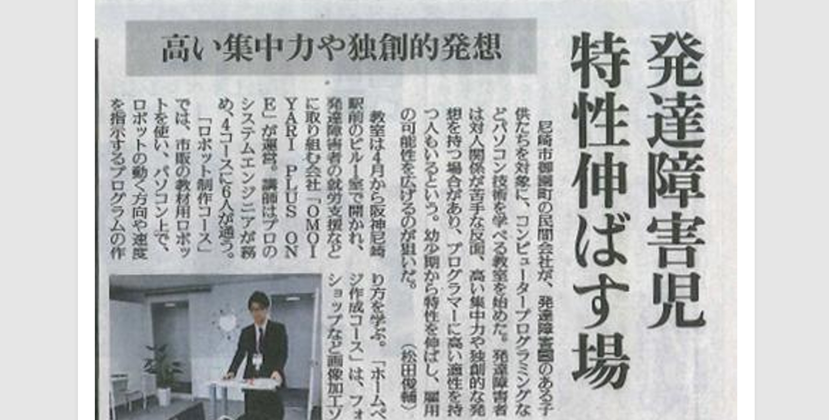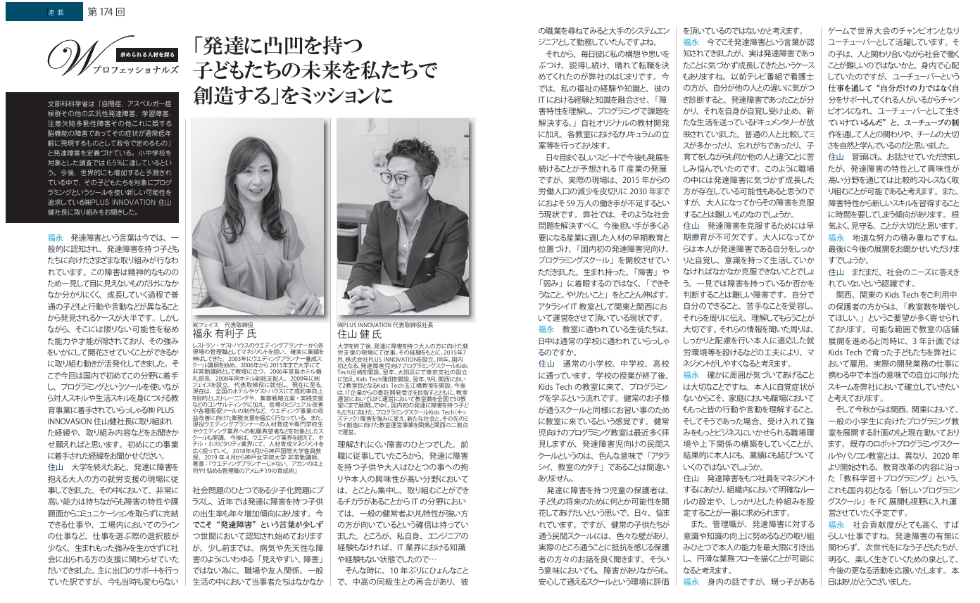 (株)プラスイノベーションでは2017年より、関西と関東を中心に精神・発達障害(ADHD・ASD・LD・起立性調節障害)をもつおこさまから大人の方を対象にITを支援の中心に取り入れたサービスの運営を行っております。日々、目まぐるしいスピードでデジタル化が進む中、2030年には国内において約60万人のIT従事者が不足することが予想されております。弊社では今後、経済発展を遂げるIT分野に発達特性を掛け合わせることで特性を持つ皆様の違いを強みに変え「支えられる」現状から未来を「支える」立場として社会に寄与する人材キャリア教育に努めて参ります。